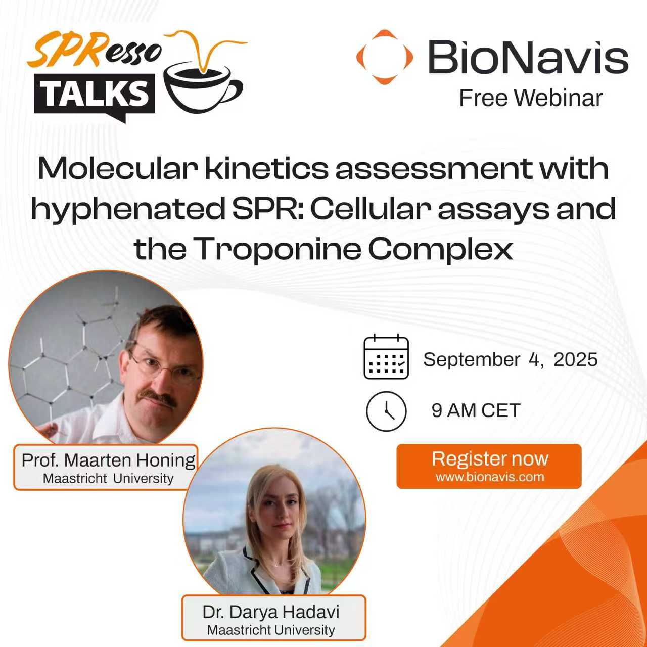 032025-09 加入BioNavis SPResso talks,獲知表面等離子體共振技術相關領域的最新研究成果。 一起聆聽來自馬斯特里赫特大學的Maarten Honing教授和Darya Hadavi博士帶來的網...